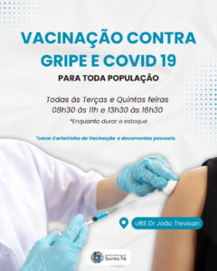 Será realizada a vacinação contra Gripe e Covid-19, todas as terças e quintas-feiras, para toda a população (enquanto durar o estoque)!