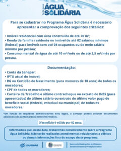 No dia 24 de maio (sábado) acontece o cadastro para o Programa Água Solidária, uma tarifa social voltada à população de baixa renda.