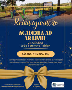 A Prefeitura Municipal de Santa Fé fica feliz em anunciar que neste sábado, 31 de maio, às 16h, acontecerá a reinauguração da Academia ao Ar Livre da Vila Rural João Torrenho Roldan.