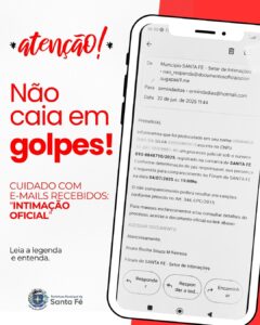 Estão circulando e-mails falsos com o assunto “Intimação Oficial”, usando indevidamente o nome da Prefeitura de Santa Fé.