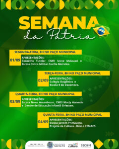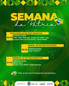 📍 As apresentações e hasteamento das bandeiras, acontecerão todos os dias (de 01/09 à 07/09), às 8h, no Paço Municipal, com a participação de escolas, instituições e entidades do nosso município.