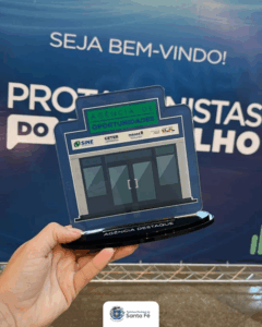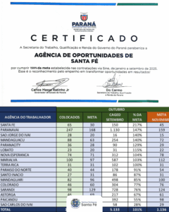Na quinta-feira, 6 de novembro, a Agência do Trabalhador de Santa Fé, vinculada à Secretaria de Desenvolvimento Econômico e Turismo, foi homenageada com o certificado da Secretaria do Trabalho, Qualificação e Renda do Governo do Paraná, pelo cumprimento de 159% da meta de contratações via SINE, no período de janeiro a setembro de 2025.