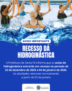 A Prefeitura de Santa Fé informa que as aulas de hidroginástica estarão em recesso de 22 de dezembro de 2025 a 04 de janeiro de 2026.