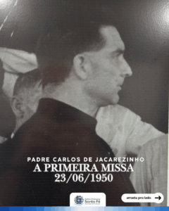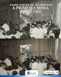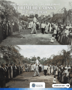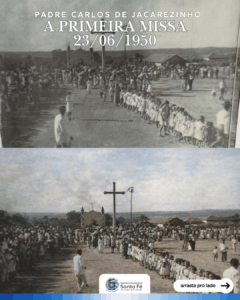 Nesta imagem, vemos o registro da primeira missa realizada no município, celebrada pelo Padre Carlos, um marco de fé e de união para a nossa comunidade.