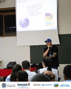 Na terça-feira (17), alunos do 3º, 4º e 5º ano da Escola 9 de Dezembro e da EOCA participaram de uma palestra sobre o uso consciente da água, realizada no auditório do Salão Paroquial de Santa Fé.